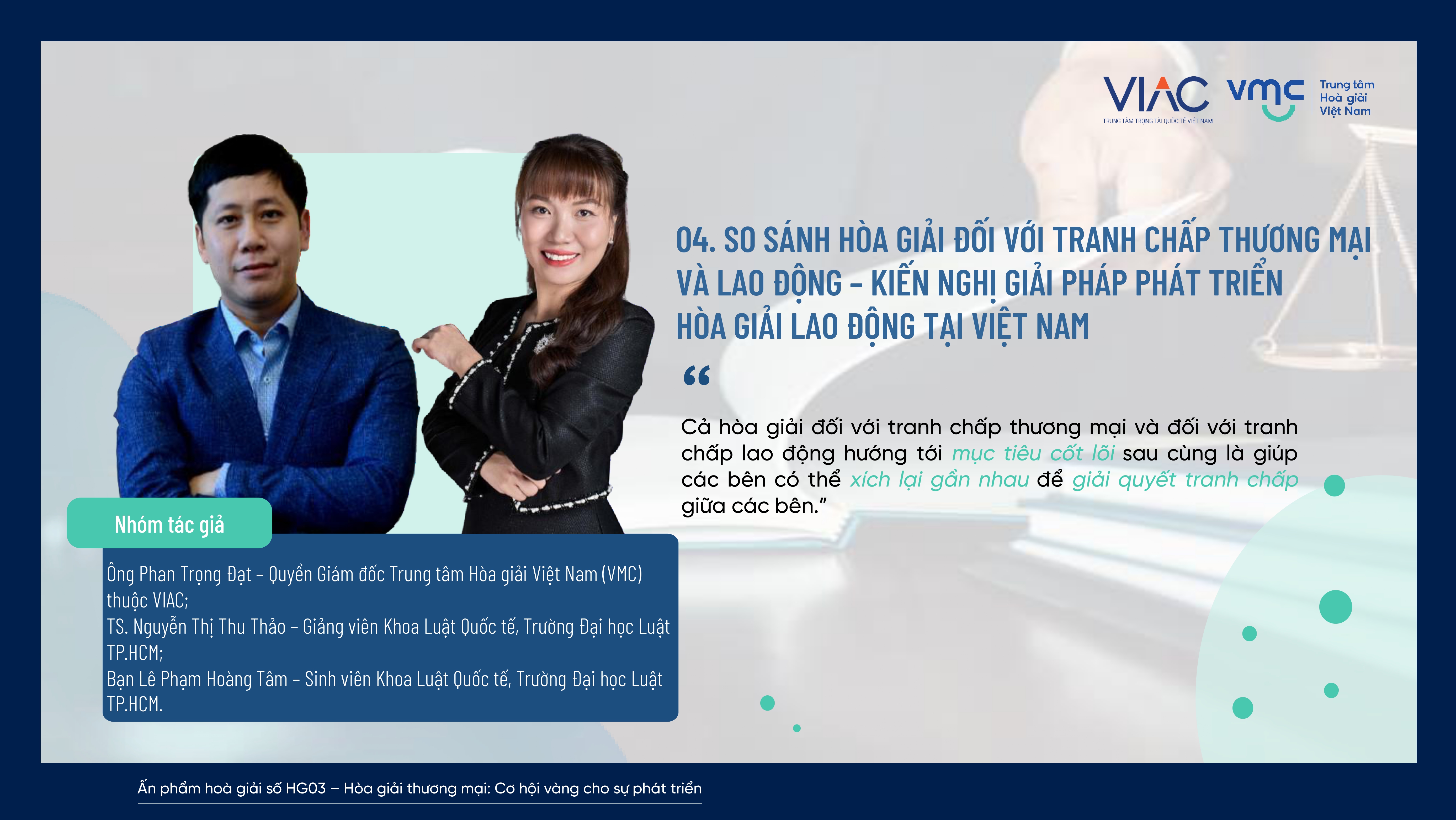 Ông Phan Trọng Đạt là Quyền Giám đốc Trung tâm Hòa giải Việt Nam (VMC) thuộc VIAC, đồng thời là Hòa giải viên thương mại với nhiều năm kinh nghiệm thực tiễn trong giải quyết tranh chấp, đào tạo và hợp tác quốc tế về ADR. Bà Nguyễn Thị Thu Thảo là giảng viên của Khoa Luật quốc tế của Trường Đại học Luật Thành phố Hồ Chí Minh (HCMUL), nơi bà giảng dạy các môn Luật Thương mại Quốc tế, Giải quyết tranh chấp hợp đồng thương mại quốc tế, Luật trọng tài thương mại quốc tế, Luật WTO, v.v. Sinh viên Lê Phạm Hoàng Tâm – Khoa Luật Quốc tế, Trường Đại học Luật TP.HCM - nghiên cứu chuyên sâu về giải quyết tranh chấp thương mại. Qua kết quả nghiên cứu và thực hành, nhóm tác giả xây dựng bức tranh tổng quan về hoà giải, đặc biệt chú trọng đến vai trò của hoà giải trong tranh chấp thương mại và tranh chấp lao động, từ đó đề xuất giải pháp cho thực tiễn tranh chấp lao động tại Việt Nam.