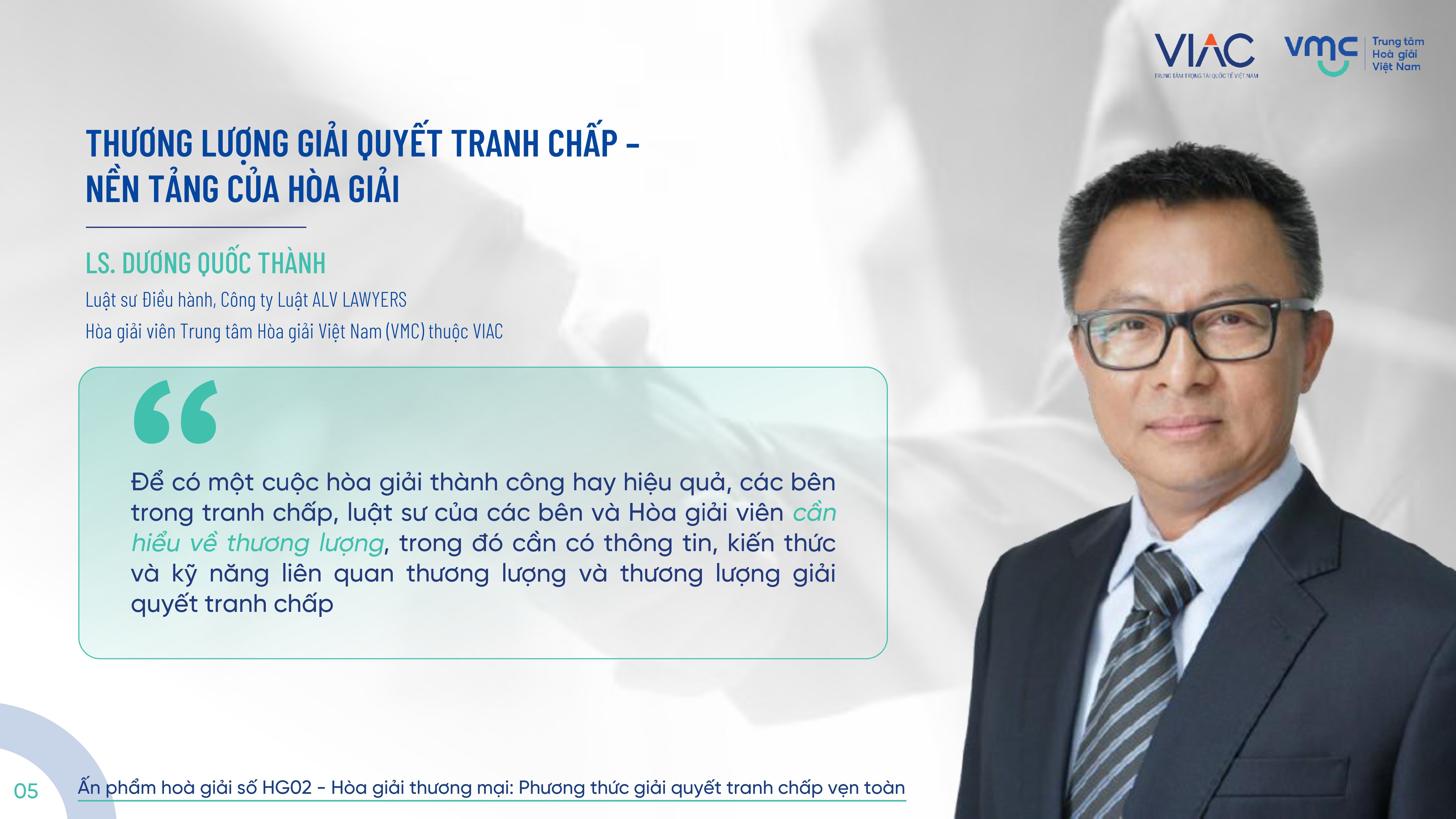 LS. Dương Quốc Thành là Luật sư điều hành Công ty Luật ALV Lawyers, đồng thời là Hòa giải viên Trung tâm Hòa giải Việt Nam (VMC) thuộc VIAC. Với hơn ba thập kỷ làm việc trong hệ thống Tòa án, hành nghề luật sư, giảng dạy tại Học viện Tư pháp và tham gia với tư cách Hòa giải viên, Trọng tài viên, ông đặc biệt quan tâm đến việc sử dụng thương lượng như một kỹ năng cốt lõi trong giải quyết tranh chấp. Trong bài viết này, tác giả hệ thống các quy định pháp luật về thương lượng trong nhiều lĩnh vực (thương mại, đầu tư, bảo hiểm, xây dựng) và chia sẻ “hành trang” thực tiễn về kỹ năng thương lượng, qua đó làm rõ vì sao thương lượng là nền tảng quan trọng của hòa giải cũng như có thể được vận dụng hiệu quả xuyên suốt quá trình tố tụng tại Tòa án và Trọng tài.