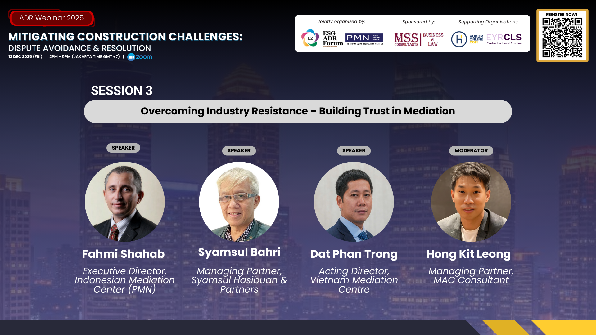 Ngày 12/12/2025, Chương trình ADR Webinar 2025 với chủ đề “Mitigating Construction Challenges: Dispute Avoidance & Resolution” sẽ được tổ chức trực tuyến trên nền tảng Zoom, từ 14h00–17h00 (giờ Việt Nam, GMT+7), bằng tiếng Anh và tiếng Bahasa Indonesia.